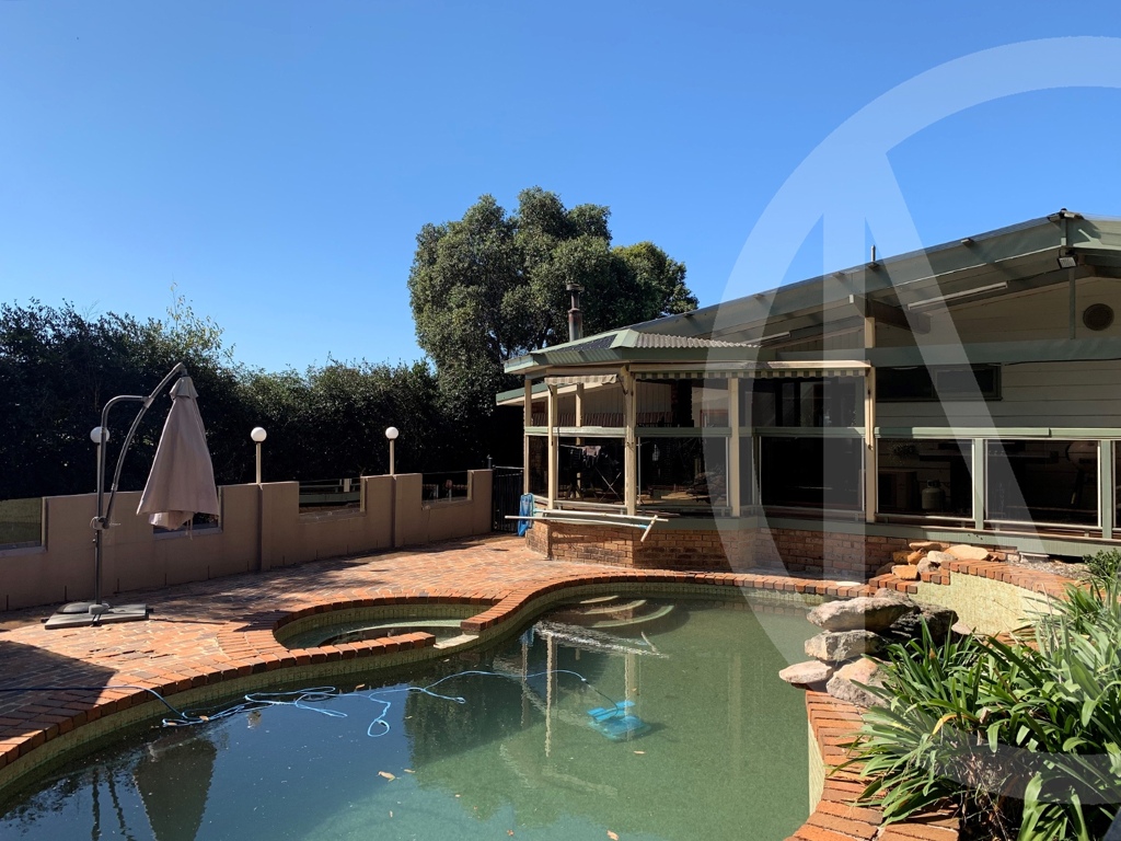 A large covered entertaining deck overlooking the sparkling in-ground pool.